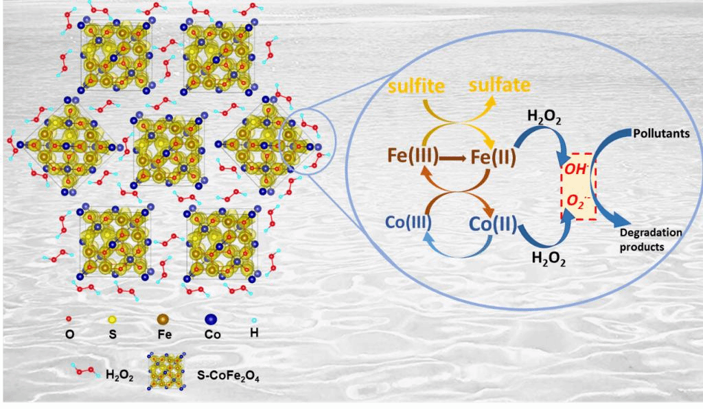 本研究首次以S-CoFe2O4作为新型芬顿催化材料,克服了传统芬顿氧化工艺中可溶性Fe2+的限制,如:pH适用范围的局限,可重复性差以及铁泥的生成等造成的二次污染等。电化学测试表明硫掺杂有效降低了CoFe2O4的电子传递内阻,结合密度泛函计算,证实了S-CoFe2O4中Fe-S键和Co-S键具有较高的电荷密度,介导不同价态的铁、钴离子得以持续循环利用。最终实现了以较低催化剂的投加量和较少反应时间,在保持活化剂重复可利用性的同时达到了对污染物的高效去除,突破了常规类芬顿氧化工艺的瓶颈。
